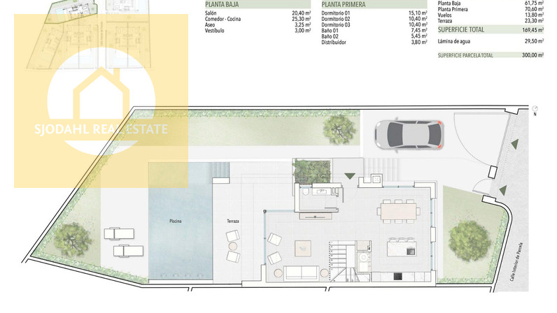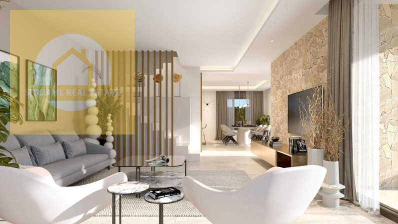 Each villa is built on a private plot of approximately 300 m2 and offers around 140 m2 of modern living space distributed over two floors. The properties feature three double bedrooms, two full bathrooms with double sinks including an en suite, and an additional guest toilet.